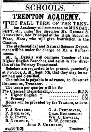 À la fin des années 1790, l'Académie organise une loterie pour collecter des fonds. En 1800, elle loue une partie du terrain à l'église presbytérienne sur State street pour y installer une école de filles. En 1807, les administrateurs de l'Académie ont adopté une résolution interdisant aux élèves de tirer avec des armes à feu dans l'enceinte de l'école. Au cours de l'hiver 1815-1816, l'Académie fut utilisée par l'église méthodiste pour organiser l'une des premières écoles du dimanche du pays. L'école a prospéré pendant de nombreuses années en tant qu'institution notable à Trenton, dans le New Jersey[4], et a été fréquentée par de nombreux hommes d'État et citoyens notables.