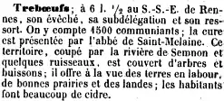 « Trebœufs ; à 6 lieues et demie au Sud-Sud-Est de Rennes, son évêché, sa subdélégation et son ressort. On y compte 1 500 communiants[24] ; la cure est présentée par l'abbé de Saint-Melaine. Ce territoire, coupé par la rivière de Semnon et quelques ruisseaux, est couvert d'arbres et de ruisseaux ; il offre à la vue des terres en labeur [labour], de bonnes prairies et des landes ; les habitants font beaucoup de cidre[25]. »
