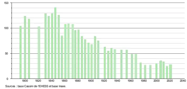 L'évolution du nombre d'habitants est connue à travers les recensements de la population effectués dans la commune depuis 1793. Pour les communes de moins de 10 000 habitants, une enquête de recensement portant sur toute la population est réalisée tous les cinq ans, les populations légales des années intermédiaires étant quant à elles estimées par interpolation ou extrapolation[20]. Pour la commune, le premier recensement exhaustif entrant dans le cadre du nouveau dispositif a été réalisé en 2005[21].