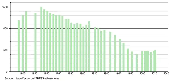 L'évolution du nombre d'habitants est connue à travers les recensements de la population effectués dans la commune depuis 1793. Pour les communes de moins de 10 000 habitants, une enquête de recensement portant sur toute la population est réalisée tous les cinq ans, les populations légales des années intermédiaires étant quant à elles estimées par interpolation ou extrapolation[17]. Pour la commune, le premier recensement exhaustif entrant dans le cadre du nouveau dispositif a été réalisé en 2004[18].