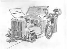 On trouve dans l'ordre : Le capot moteur, un habitacle pour deux personnes avec un pare-brise et une capote rabattable puis un capot recouvrant les deux tambours de câbles.