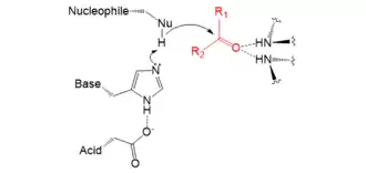 Aucun acide aminé naturel n'étant suffisamment nucléophile pour catalyser seul les réactions chimiques en question, les triades catalytiques font intervenir une base qui polarise et déprotone le nucléophile afin d'accroître sa réactivité. Cette base déprotone également le premier produit de réaction pour favoriser l'élimination du groupe partant.