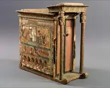 Naos votif à traîneau et pronaos soutenu par des colonnes hathoriques, dédié par l'artisan Kasa à la triade d'Éléphantine. Musée égyptologique de Turin.