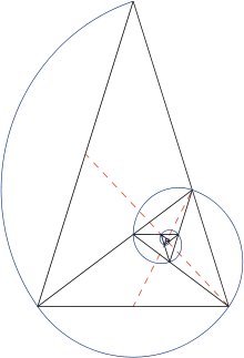 Le triangle d'or peut être utilisé pour placer certains points d'une spirale logarithmique. En procédant à la bissection d'un angle à la base d'un triangle d'or, on obtient un nouveau point, qui à son tour forme un nouveau triangle d'or[7]. En répétant ce procédé, on obtient des points qui permettent de tracer à main levée une spirale logarithmique (voir dernière figure).
