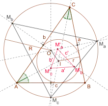Pour un triangle donné et son cercle circonscrit, on désigne les milieux des arcs aux côtés du triangle respectivement . Ces points médians sont reflétés sur les côtés du triangle associés, ce qui donne les points , qui forment le triangle de Fuhrmann[1],[2].