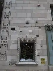 Au-dessus de l'entrée principale, formant une voûte en granit gris et rose (côté ouest du bâtiment sur Michigan Avenue), se trouve une sculpture monumentale en pierre représentant des personnages des fables d'Ésope, des animaux (tels que des aigles, des loups, des serpents, des singes et des coqs…), des feuilles d'acanthe, des volutes et des rubans[29],[30]. Des grotesques se trouvent sous les fenêtres du quatrième étage, là où se trouve la salle de presse. Le mur de l'entrée du bâtiment est connu sous le nom de « Hall des inscriptions » (Hall of Inscriptions) et présente des gravures de citations célèbres du poète et pamphlétaire John Milton et de personnalités telles que Benjamin Franklin, Voltaire, Thomas Jefferson et James Madison louant et exaltant la liberté d'expression et la liberté de la presse[22],[31]. Des expressions célèbres et des termes employés par Abraham Lincoln, Arthur Miller et Thurgood Marshall sont gravés sur les murs du hall de Nathan Hale (The Nathan Hale Lobby).