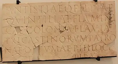 Leur capitale est appelée Augusta Tricastinorum par Pline l'Ancien[5]. Cependant, aucune source ne la présente comme une colonie romaine avant l'époque des Flaviens. Le cadastre B d'Orange, l'antique Arausio, indique une fixation tardive de leur frontière sud lors de l'érection d'Orange en colonie : c'est en 77 que la capitale des Tricastins reçoit le nom de Colonia Flavia Tricastinorum[6]. Une inscription latine d’époque romaine concernant leur cité a été retrouvée en 1961 lors des fouilles de la rue dite « aux colonnes » à Vaison-la-Romaine et conservée au musée archéologique Theo Desplans. Gravée sur plaque de marbre, elle était destinée à compléter une base de statue. Elle honore Antistia Pia Quintilla qui fut flaminique de la colonia Flavia Tricastinorum, et a été élevée par son affranchi Philocrite ou Philocrate[7],[8]. La table de Peutinger donne le nom gaulois de cette ville, Senomagus, qui serait le quartier de Saint-Pierre-de-Sénos à Bollène[9].
