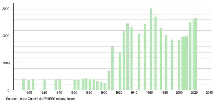 L'évolution du nombre d'habitants est connue à travers les recensements de la population effectués dans la commune depuis 1793. Pour les communes de moins de 10 000 habitants, une enquête de recensement portant sur toute la population est réalisée tous les cinq ans, les populations légales des années intermédiaires étant quant à elles estimées par interpolation ou extrapolation[27]. Pour la commune, le premier recensement exhaustif entrant dans le cadre du nouveau dispositif a été réalisé en 2004[28].