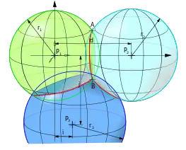Si trois points de référence émettent un signal d'intensité d'émission connue par un récepteur, il est possible de connaitre la distance entre chacun de ces points et le récepteur. Il apparait alors le point récepteur qui est l'intersection de 3 sphères.