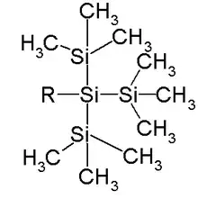 - d'une part, le groupe tri(triméthylsilyl)silyle qui consiste en trois groupes triméthylsilyles liés à un même atome de silicium (TTMSS ou TMS3Si)