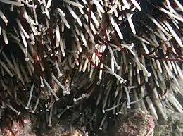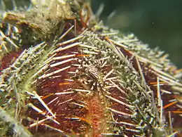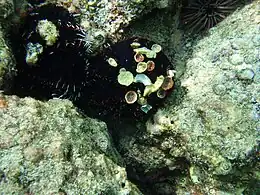 Cet oursin peut héberger certains symbiotes, comme les petites crevettes nettoyeuses du genre Periclimenes ou le crabe Zebrida adamsii, ou la minuscule crevette naine Gnathophylloides mineri, qui lui est un symbiote exclusif[5] .