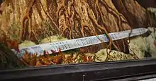 Au pied du tronc où est dressée la croix, une épée porte la devise du général Vanuxem « DUM CREDO VINCO », « Tant que j’ai la foi, je vaincrai ». Au pied de la croix une éponge, un jeu de dés, un calice, le graal qui recueillit le sang du Christ, un maillet et les clous, instruments de la passion.