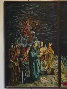 Le panneau central du triptyque représente la descente de croix ; les deux panneaux latéraux les saints patrons des armées.
