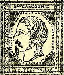 En 1859, l'autorité de l'île prend la décision de développer la correspondance interne, c'est pourquoi en l'absence de timbres postaux l'administration de la colonie décide d'émettre ses propres timbres. La conception du timbre est confiée au sergent Louis Triquéra, graveur dans la vie civile. En utilisant comme motif l'image de l'empereur Napoléon III en 1853, avec peu de moyens, le sergent prépare sur la pierre lithographique 50 clichés pour les timbres. Il grave chaque cliché séparément, et par conséquent tous les timbres diffèrent les uns des autres, on peut donc dire qu'il existe 50 variations de ce timbre. La seule imprimerie de journaux de l'île fut utilisée pour l'impression des timbres postaux.