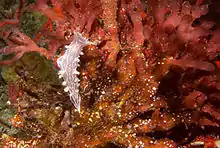 Le corps se caractérise par sa coloration translucide : le plus souvent blanche mais parfois comprise entre le jaune et le brun[5]. Des lignes opaques, souvent blanches, dessinent des diamants sur le dos de l'animal ; ce motif n'est pas toujours visible. Jusqu'à 16 panaches branchiaux sont disposés de chaque côté du corps[3]. Les rhinophores sont entourés d'une touffe brune qui ressemble aux polypes de Discophyton rudyi ; des organes sensoriels sont présents sur la tête[5],[6].
