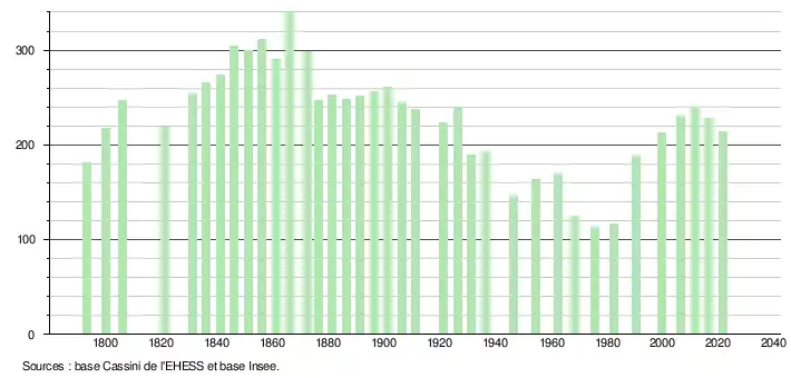 L'évolution du nombre d'habitants est connue à travers les recensements de la population effectués dans la commune depuis 1793. Pour les communes de moins de 10 000 habitants, une enquête de recensement portant sur toute la population est réalisée tous les cinq ans, les populations légales des années intermédiaires étant quant à elles estimées par interpolation ou extrapolation[21]. Pour la commune, le premier recensement exhaustif entrant dans le cadre du nouveau dispositif a été réalisé en 2006[22].