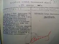 Entre août 1937 et octobre 1938 sur ordre des Troïkas NKVD (no 00447), 767 397 personnes furent condamnées parmi lesquels 386 798 à la mort par fusillade[3].