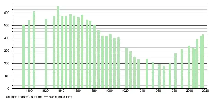 L'évolution du nombre d'habitants est connue à travers les recensements de la population effectués dans la commune depuis 1793. Pour les communes de moins de 10 000 habitants, une enquête de recensement portant sur toute la population est réalisée tous les cinq ans, les populations légales des années intermédiaires étant quant à elles estimées par interpolation ou extrapolation[6]. Pour la commune, le premier recensement exhaustif entrant dans le cadre du nouveau dispositif a été réalisé en 2004[7].