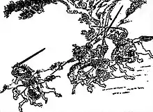 Liu Bei, lui aussi passé à la postérité comme un combattant remarquable, est issu d'une famille pauvre, déclassée. Il a su s'affirmer en dépit de nombreux revers, après avoir servi d'autres chefs de guerre (Gongsun Zan, Cao Cao, Yuan Shang). Il reçoit l'aide de ses compagnons loyaux, entrés comme lui dans la légende : les vaillants généraux Guan Yu et Zhang Fei et celui qui est considéré comme le plus brillant stratège de l'époque, Zhuge Liang[57]. D'autres ont eu moins de succès, mais représentent tout aussi bien ce groupe marqué par l'incertitude et les revers de fortune funestes. Yuan Shao, un des premiers généraux à émerger au moment de la chute des Han, se constitue une base territoriale mais subit une défaite face à Cao Cao peu avant de mourir. Ses fils Yuan Shang (en) et Yuan Tan (en) se querellent ensuite pour récupérer l'héritage paternel et finissent tués par d'autres chefs de guerre[22].
