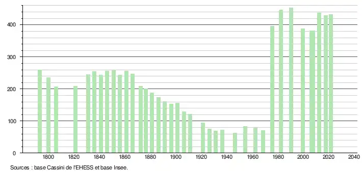L'évolution du nombre d'habitants est connue à travers les recensements de la population effectués dans la commune depuis 1793. Pour les communes de moins de 10 000 habitants, une enquête de recensement portant sur toute la population est réalisée tous les cinq ans, les populations légales des années intermédiaires étant quant à elles estimées par interpolation ou extrapolation[15]. Pour la commune, le premier recensement exhaustif entrant dans le cadre du nouveau dispositif a été réalisé en 2007[16].