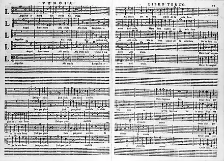 Les madrigaux sont composés pour cinq voix, à savoir le canto qui correspond à la voix supérieure, souvent tenue dans les interprétations modernes par une soprano, la deuxième voix, l'alto (mezzo soprano, contre alto, ou contre ténor), ensuite le tenore (ténor), le basso (basse), et le quinto. Cette dernière partie, n'équivaut pas à une tessiture précise, mais pouvait être chantée par une deuxième soprano, alto ou ténor selon les madrigaux, on désignait cette partie dans les traités musicaux du XVIe siècle sous la dénomination de vox vagans, signifiant « voix errante »[1]. Le dernier madrigal Donna, se m'ancidete est composé pour six voix.