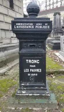 Certains troncs sont situés dans des lieux profanes ou laïcs, comme par exemple les cimetières. C'est le cas à Paris, où la collecte est opérée par l'Assistance publique aux profits des pauvres. Voir photo ci-contre.