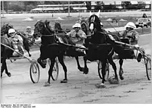 Le trotteur allemand Romulus, après sa victoire au derby du trot de RDA, avec son driver Werner Bandermann en 1985 | |