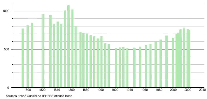 L'évolution du nombre d'habitants est connue à travers les recensements de la population effectués dans la commune depuis 1793. Pour les communes de moins de 10 000 habitants, une enquête de recensement portant sur toute la population est réalisée tous les cinq ans, les populations légales des années intermédiaires étant quant à elles estimées par interpolation ou extrapolation[20]. Pour la commune, le premier recensement exhaustif entrant dans le cadre du nouveau dispositif a été réalisé en 2004[21].