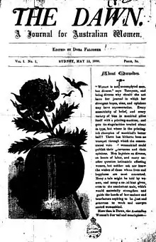 Couverture du numéro 1 de The Dawn, . Le premier magazine féministe en Australie.