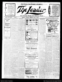 Première page de The Leader ( Orange, Nouvelle-Galles du Sud ) 31 juillet 1915, la 10 millionième page de journal mise à disposition via Trove[33].