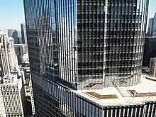 La tour entre l'Aon Center (à gauche) et la Willis Tower (à droite) depuis le 875 North Michigan Avenue.