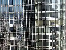 Le mur-rideau du bâtiment, réalisé par l'entreprise Permasteelisa[7], utilise un verre clair à revêtement à faible émissivité et un système de meneaux en acier inoxydable poli en forme d'ailes incurvées qui dépassent de 9 pouces (23 cm) de la ligne de vitrage. Il intègre des panneaux d'allège en acier inoxydable brossé et en aluminium anodisé transparent.