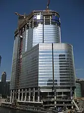 Toutefois, lorsqu'elle fut présentée au public, la première version du gratte-ciel ne rencontra pas d'engouement auprès des habitants de Chicago et l'on doit l'apparence du bâtiment actuel à une révision ultérieure des plans en juillet 2002. En janvier 2004, une autre révision modifia le contenu des étages 17 à 26 et installa des appartements et des chambres d'hôtel en lieu et place des bureaux. Les travaux de construction commencèrent le .