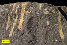Trypanites borings in an Upper Ordovician hardground from northern Kentucky. The borings are filled with diagenetic dolomite (yellowish). Note that the boring on the far right cuts through a shell in the matrix.