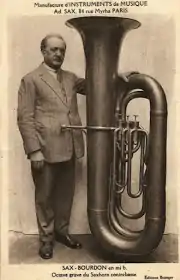 La première conception d'un instrument du type tuba géant a été présentée à l'Exposition universelle de 1851 au Crystal Palace à Londres par l'inventeur d'instrument belge Adolphe Sax (1814–1894), inventeur également du saxophone, qui l'a surnommé le saxhorn sous-contrebasse[1] (ou saxhorn bourdon géant en mi bémol). Sax obtient une Council Medal pour l’ensemble de ses instruments et spécialement pour ce saxhorn « bourdon »[2]. Sa taille atteignait 3 m, le pavillon 1 m de diamètre et la longueur totale du tube mesurait 17 m (52 pieds)[3]. Il était présenté par Sax avec d'autres instruments géants, comme un saxtuba géant, lors des expositions de l'époque et la presse en faisait l'écho[3]. Il constitue le tuba le plus grand jamais réalisé au monde et a été vendu lors de la vente aux enchères des collections d'instruments d'Adolphe Sax lors sa dernière faillite dans les années 1877. Néanmoins il n'est pas réapparu à ce jour. Un exemplaire plus petit de saxhorn bourdon, mesurant plus de 1,80 m en hauteur et daté vers 1855, appartient à la maison Henri Selmer Paris depuis le rachat des ateliers Sax de la rue Myrha à Paris en 1929 et était autrefois visible dans le hall du premier étage du siège social, rue de la Fontaine au Roi avant son déménagement en 2018[4]. Ces instruments sont tous très rares et n'ont jamais reçu beaucoup d'attention au niveau musical. Leur objectif est plus de démontrer la compétence du facteur d'instruments et de créer un objet de curiosité lors des salons (expositions universelles…).