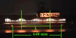 Les flammes sont plus hautes quand la pression du gaz ne varie pas, aux nœuds de l'onde stationnaire. La longueur entre deux crêtes, ou creux, est la demi-longueur d'onde.