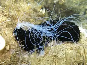 Une holothurie têtue (Holothuria pervicax) émettant ses tubes de Cuvier à La Réunion.