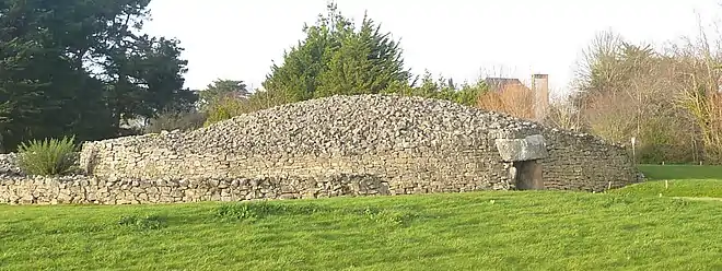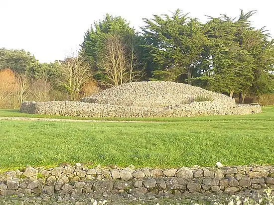 - vers , la petite chambre funéraire entourée d'un cairn circulaire. Le tout est englobé dans une masse de pierres sèches trapézoïdale.