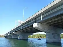 Afin de diminuer la longueur totale à être creusée, la décision fut prise de faire aboutir le tunnel sur l'île Charron, qui fait partie de l'archipel des îles de Boucherville. Un pont dut donc être construit pour enjamber le bras d'eau restant entre l'île et la Rive-Sud. Complété en 1966, ce pont à poutres en béton précontraint et acier de neuf travées[4] est long de 476,8 m et haut d'environ 8 m au-dessus de l'eau. Un échangeur sur l'île forme la seule voie d'accès terrestre au parc national des Îles-de-Boucherville.