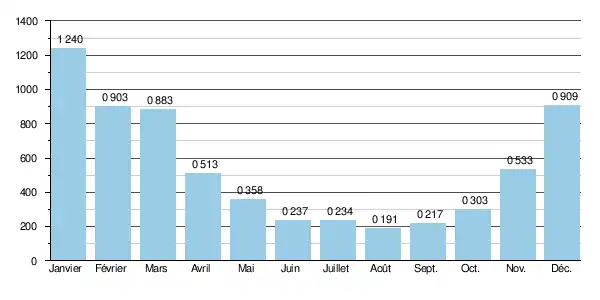 Les crues peuvent être assez importantes, du moins compte tenu de l'exiguïté du bassin de la rivière. Ainsi les QIX 2 et QIX 5 valent respectivement 12 et 19 m3/s. Le QIX 10 est de 24 m3/s, le QIX 20 est de 28 m3/s, tandis que le QIX 50 n'a pas été calculé faute d'une durée d'observation suffisante pour le déterminer (14 ans).