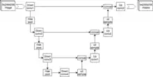 Le réseau se compose d'une partie contractante et une voie expansive, ce qui lui confère une architecture en forme de «U». La partie contractante est un réseau de convolution typique qui consiste en une application répétée de convolutions, chacune suivie d'une unité linéaire rectifiée (ReLU) et d'une opération de pooling maximum. Pendant la contraction, les informations spatiales sont réduites tandis que les informations sur les caractéristiques sont augmentées. La voie expansive combine les informations de caractéristiques géographiques et spatiales à travers une séquence de convolutions et concaténations ascendantes avec des fonctionnalités haute résolution issues de la voie contractante[6].