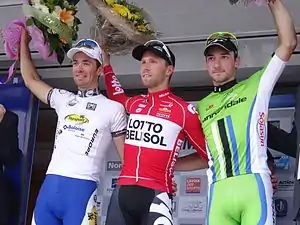 Podium de l'édition 2014 du Grand Prix de Wallonie : Jan Bakelants (3e), Greg Van Avermaet (1er) et Tony Gallopin (2e).