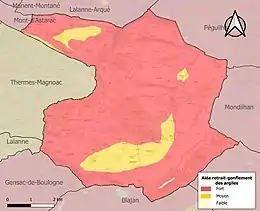 Le retrait-gonflement des sols argileux est susceptible d'engendrer des dommages importants aux bâtiments en cas d’alternance de périodes de sécheresse et de pluie. 99,9 % de la superficie communale est en aléa moyen ou fort (88,8 % au niveau départemental et 48,5 % au niveau national). Sur les 739 bâtiments dénombrés sur la commune en 2019, 739 sont en aléa moyen ou fort, soit 100 %, à comparer aux 98 % au niveau départemental et 54 % au niveau national. Une cartographie de l'exposition du territoire national au retrait gonflement des sols argileux est disponible sur le site du BRGM[29],[Carte 3].
