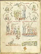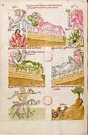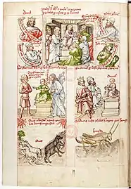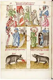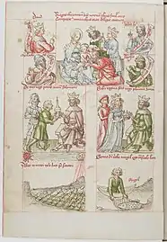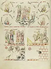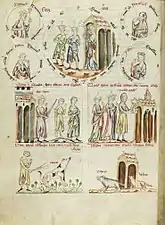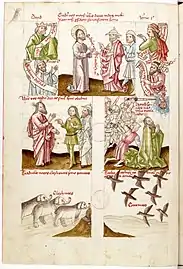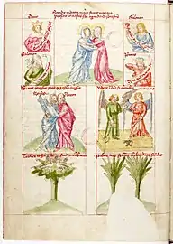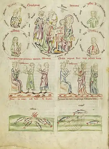 - Dans une rangée en-dessous, cette scène est expliquée et illustrée par deux images avec des correspondances de l'Ancien Testament