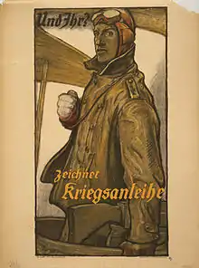 Comme l'affiche Helft uns siegen l'œuvre est réalisé à la manière du gravure sur bois expressionniste. Elle représente aussi un soldat, non plus un fantassin mais un aviateur. Bien que l'aviation allemande ait été pendant la guerre rattachée à l'armée de terre impériale, les exploits des aviateurs, réputés téméraires et casse-cou étaient connus de tous. Le soldat légèrement blessé regarde l'observateur et pose la question : « Et vous ? Souscrivez à l'obligation de guerre ». Comme pour l'affiche précédente, c'est le regard du soldat qui lui donne toute sa signification.rend l'affiche . La conception artistique a été critiquée et considérée comme une régression par rapport à «Helft uns siegen» ; pourtant la simplicité de l'image et la brièveté du texte renforcent son impact[1].