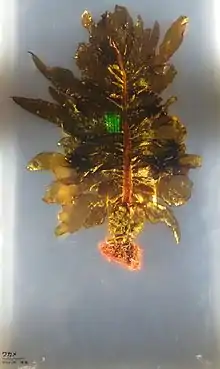 Undaria pinnatifida est une algue brune, avec une forme particulière comportant un « pied » et de longues feuilles.