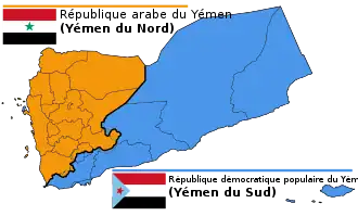 La république du Yémen fut déclarée le [3]. Ali Abdallah Saleh devint le président du Yémen, Ali Salim al-Beidh le vice-président et Haider Aboubaker al-Attas le Premier ministre du Yémen. Une période transitoire de 30 mois fut fixée afin de fusionner les deux systèmes politiques et économiques, ainsi que les lois en vigueur dans les régions des deux anciennes républiques[4]. Un conseil présidentiel fut élu par les parlements respectifs des deux anciens pays. Un nouveau parlement, commun aux deux pays, la Chambre des députés transitoire unifiée, voit le jour. Elle est composée de 159 membres originaires du Nord, de 111 membres originaires du Sud et de 31 membres indépendants nommés par le président du Conseil présidentiel et originaires de tout le pays.