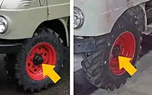 Le 411 original et le type 411a sont équipés d'un essieu portique appelé «essieu en tôle», fabriqué par Erhard & Söhne. L'essieu en tôle se compose de deux coques en tôle en forme de U, chacune d'environ 1,2 m de long, avec un décalage pour le différentiel au milieu; Les deux coques en tôle sont soudées l'une au-dessus de l'autre pour former un axe banjo. Le différentiel et les arbres de transmission sont situés à l’intérieur. Un boîtier séparé pour les engrenages de la roue est vissé sur l'extérieur de chaque côté des essieux en tôle. Il y a une vis de fixation centrale dans le moyeu de roue, clairement visible de l'extérieur[49]. À partir de 1963, avec le type 411b, Daimler-Benz a également installé l'essieu de l’Unimog 406 sous une forme modifiée sur le 411. Les nouveaux essieux sont constitués d'un carter de différentiel et de deux moitiés d'essieu moulées d'environ 0,6 m de long, aux extrémités intérieures desquelles est formée une demi-cloche de différentiel. Les deux moitiés d'essieu sont reliées verticalement au carter de différentiel à l'aide de vis hexagonales internes (axe en entonnoir). Les transmissions à turbine sont vissées aux extrémités extérieures. La particularité extérieure du nouvel essieu est le moyeu, duquel ne dépasse aucune vis de blocage de roue (voir photo de droite). Ce nouvel essieu était moins cher à fabriquer, plus facile à entretenir et plus résistant que l'essieu en tôle. Le rapport des essieux de l’Unimog sont de 25:7 (411 original, 411a, 411b) ou 35:9 (411c)[11].