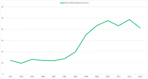 Après avoir stagné pendant plus de cinquante ans, l'UDC passe de 11,9 % aux élections au Conseil national en 1991 à 28,9 % en 2007; une évolution unique depuis l'introduction de la proportionnelle en 1919[27].