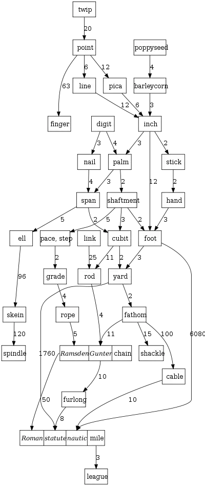 On retrouve des unités de longueur dans différents autres systèmes d'unités de mesure anciennes, généralement reliées entre elles par des ratios simples.